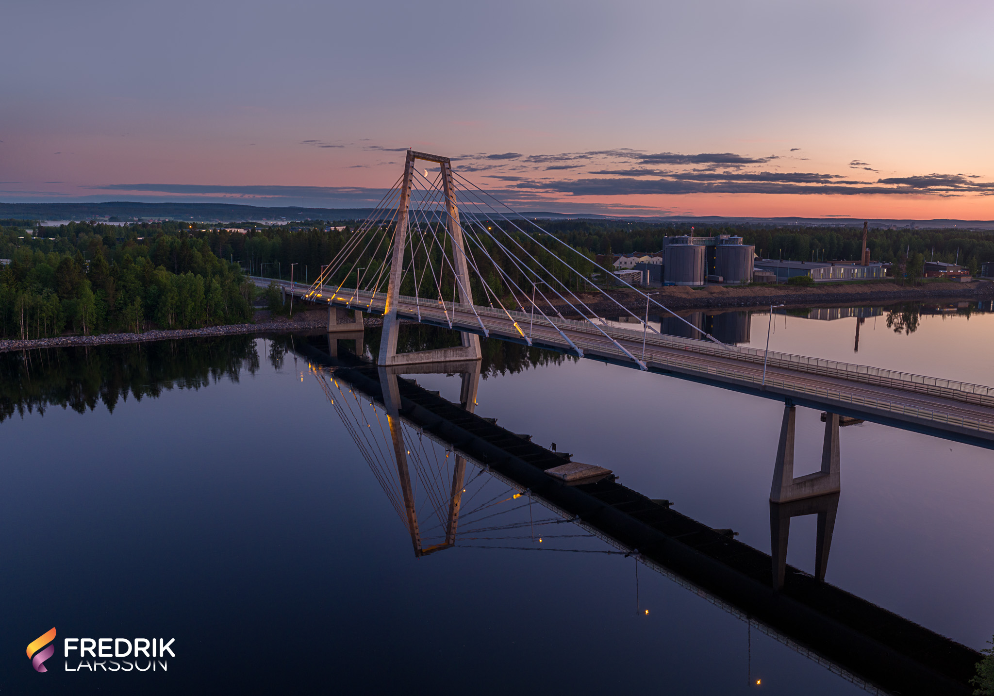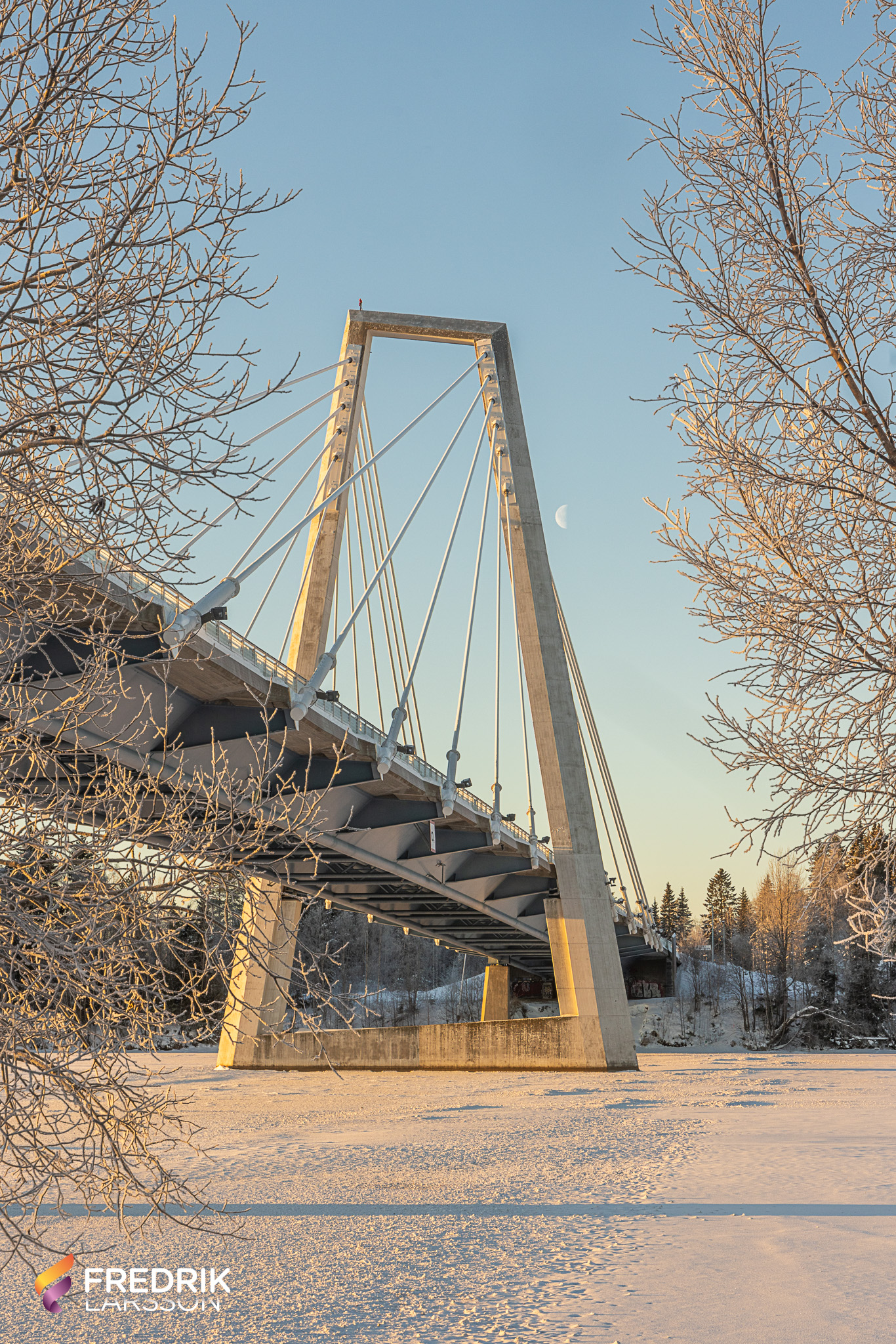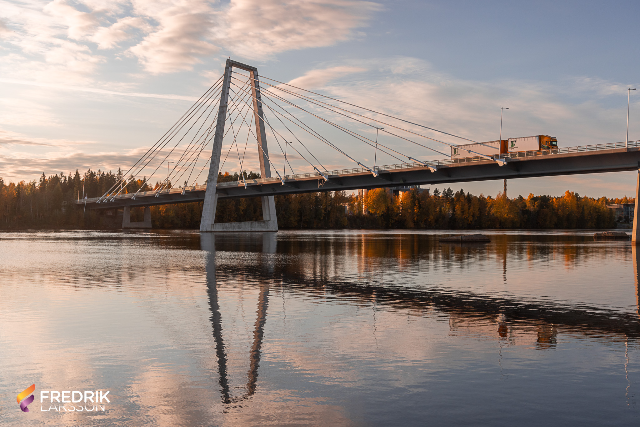 The pylon bridge is supported by two towering pylons, which rise 82 meters above the river, with cables fanning out to hold the bridge deck in place. This design allows the bridge to have a long central span of 179 meters, making it one of the longest cable-stayed bridges in Sweden.