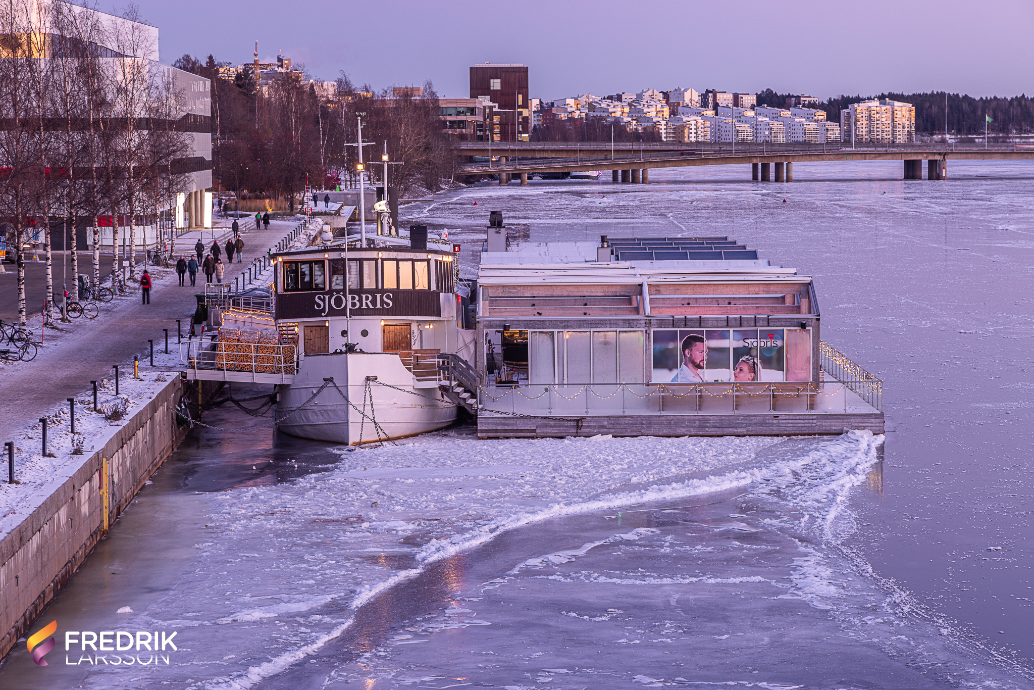 Eng: This historic boat was built in 1915 at Bergsunds Mekaniska Verkstad in Stockholm, to be used as a tug and waterboat. In 1958, she was converted from a steamship to a motorboat, and since then she has changed owners multiple times, eventually ending up in Luleå, where she was christened Mistral af Luleå. And it was also there, on 5 February 1994, that she sank. Later that same year, Ingermar Riström began working to save the vessel. The following year, he sold her to Rederi AB Sjöbris, from which she later received her final name, Sjöbris Af Umeå. All the boatʼs furnishings were removed, and she was converted into a restaurant. In the spring of 1999, she was towed to her current location on Umeåʼs quay, where she is still anchored today, hosting countless satisfied diners year-round.
